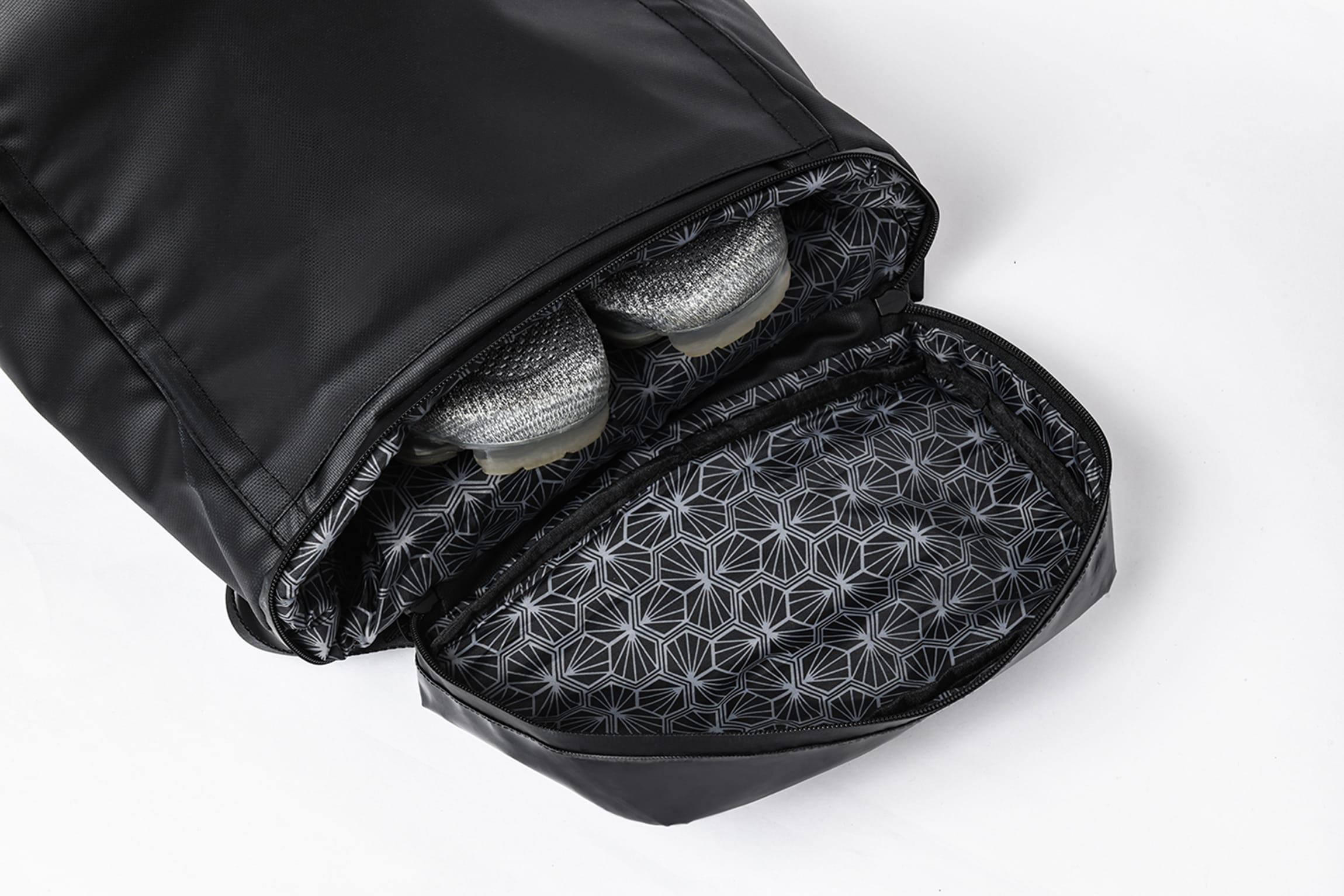 下部にはシューズや着替え用の別コンパートメントを装備。デザイン性と止水性を高めたファスナーを改良し、開閉もスムーズになりました。仕事帰りのジムもこのバッグ一つで足ります。